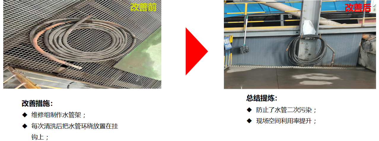 據(jù)了解,3月份,在現(xiàn)場共收集6S管理整改問題106條,已完成整改96條,整改率達90.6%。整改后選廠車間的生產(chǎn)環(huán)境得到了極大改善。
